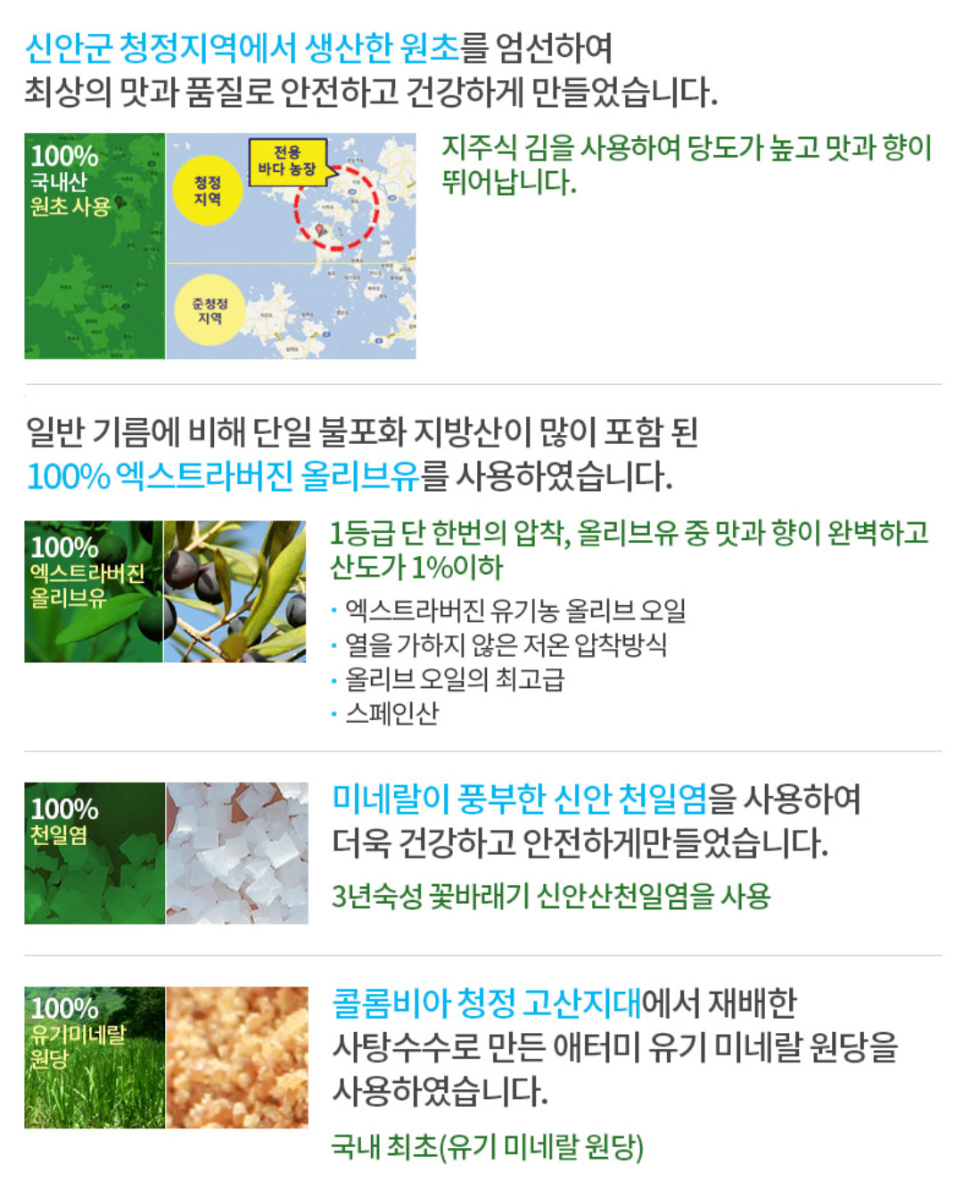 ・ 选用韩国新安郡海域生产的日晒海盐,含矿物质,纯净天然,健康无负担。